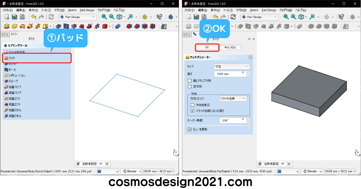 初期設定が完了したら、FreeCADの動作確認を兼ねて、3Dモデルを試しに作ってみます。