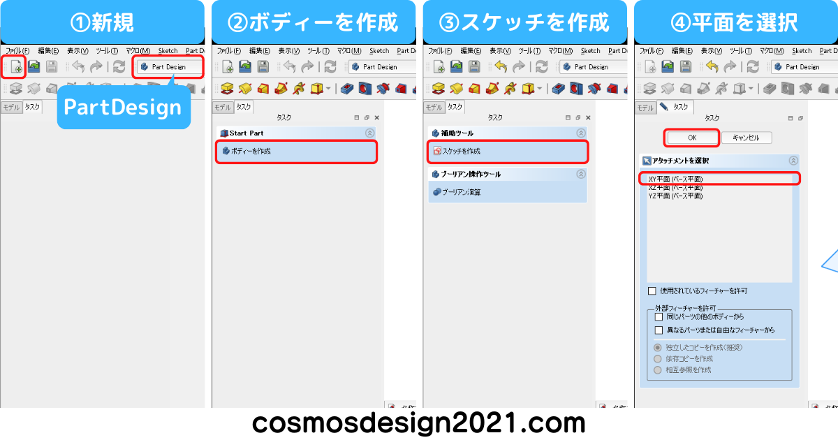 最初に画面上部のワークベンチ選択で「Part Design」を選択したら、下記の手順でSketcherワークベンチを開きます。